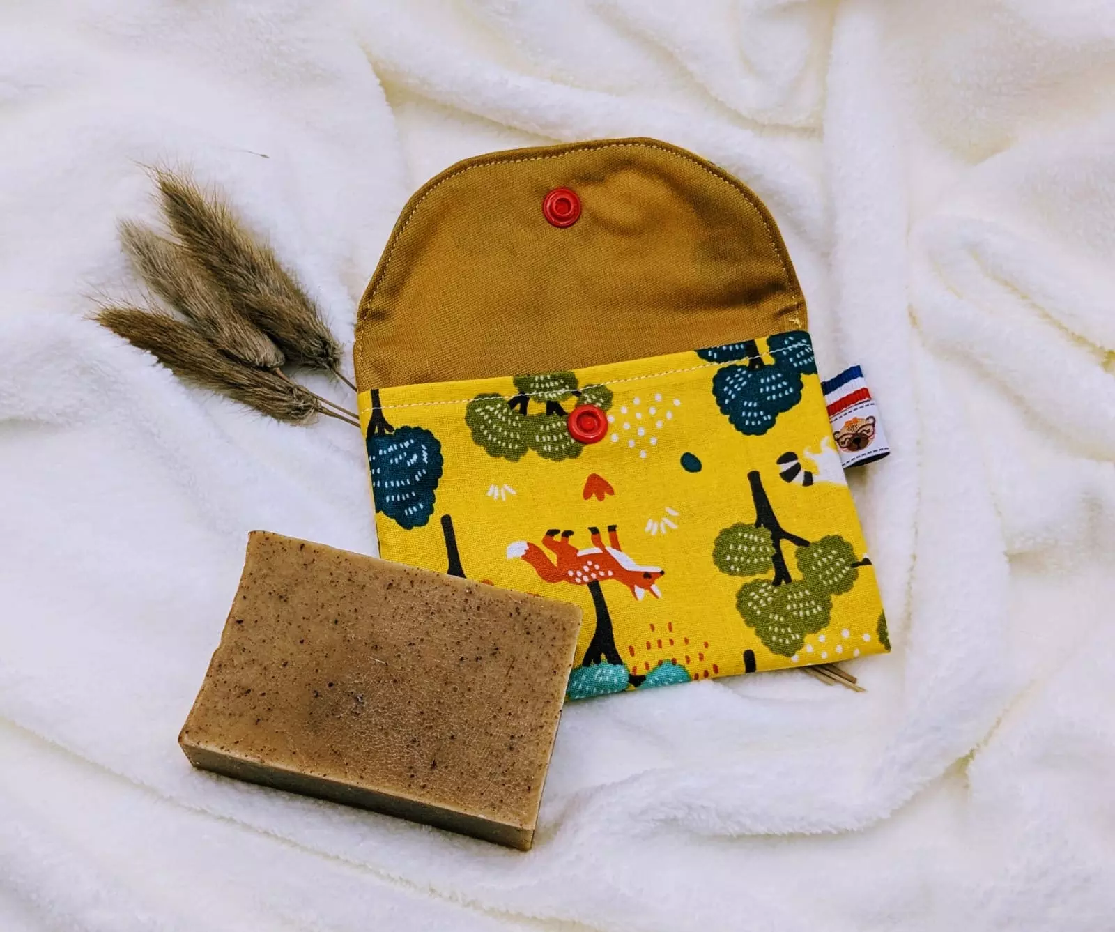 Notre pochette pression est confectionnée artisanalement, en France, avec soin à partir de tissu coton doté d’un revêtement OEKO-TEX, garantissant des matériaux respectueux de votre santé et de l’environnement. Ce revêtement imperméable permet de transporter votre savon encore mouillé sans risque de fuite dans votre pochette pression, tout en maintenant une texture douce et agréable au toucher.