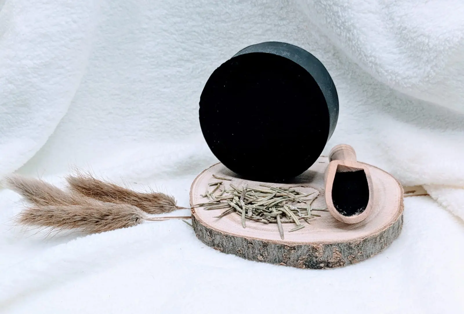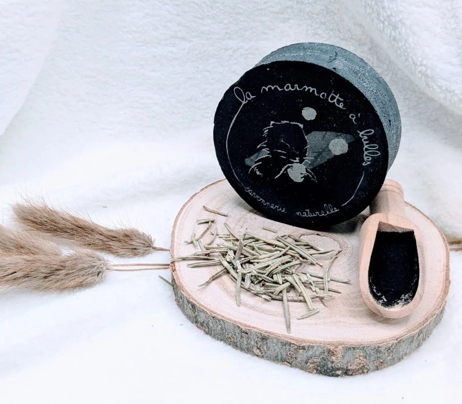 Ingrédients : Savon à base d’eau, beurre de karité*, huile d’olive*,huile de coco*, huile de colza*, hydroxyde de sodium, huile de ricin*, huile essentielle d’écorce de cèdre de l’Atlas*, charbon poudre, argile rouge, huile essentielle de romarin*, mica, huile essentielle de feuille d’arbre de thé*, glycérine (naturellement issue de la saponification). *issus de l’agriculture biologique